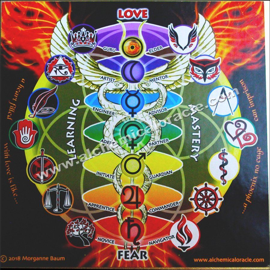 Inspired by the themes of Alchemy, I came up with this system of divination and self-reflection that drew upon many other areas of my education and interest: Jungian archetypes and psychology; mythology and spiritual figures from multiple cultures and origins; chakras, energy work and metaphysics; the Tarot and its Major Arcana; and other concepts of symbolic language and metaphoric cycles such as the Hero’s Journey as described by Joseph Campbell, the ancient Sumerian myth of Inanna, and the death/rebirth myth of the Phoenix.